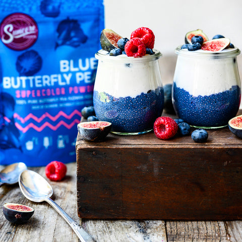 The color of these magnificent Blue Butterfly Pea Chia Puddings are spectacular, plus theses jars are an extra delicious jumpstart to the day! We L-O-V-E seeing our powder in action! Take your breakfast game to the next level with Suncore Foods® and bring on the bold blue color and add some creative coloring to your next dish!