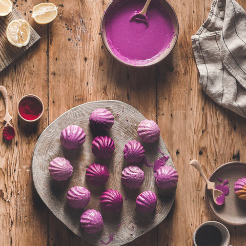 Who doesn't love warm, buttery, velvety, delicate little cakes? These delicious purple hue lemon madeleines will make a perfect snack! Refreshing, stunningly delicious, and vibrant lemon madeleines with golden-crisp edges, moist and pillow-soft center, these treats will make everyone crave for more! Color it romantic purple with Suncore Foods® Cosmos Red Cabbage and Ruby Red Radish Powders. Get your cup of tea, have a bite of this deliciousness, and call it an afternoon. Great for any time, any day, or a snack to fuel your endeavors!