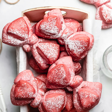 Tied together in a perfect bow, these Pink Pitaya Fluffy Bow Tie Buns are a sweet treat that instantly emits happiness into our day! These are so adorable, yummy, and make a pretty pink by using our Suncore Foods® Pink Pitaya Powder & Suncore Foods® Red Beet Powder! Baked to the perfect fluffiness, no one will be able to stop eating these once they taste how soft and pillowy these buns are. If you want to get a taste of these cushiony treats, be sure to grab a bag or two of our powders.