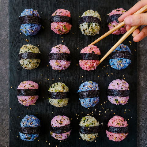 7. To color the rice, simply divided the sushi rice into 4 and diluted 1 tsp each of the powders (butterfly pea, sweet potato, red beet, and pandan) in 2 tbsp water each before mixing it into each bowl of sushi rice. Then mixed in some furikake and mixed it before shaping the balls and wrapping the strips of nori!