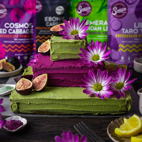 3. Buttercream — Using an electric beater, beat butter for 2 minutes. Mix in cream of tartar and vanilla extract. Mix in powdered sugar, 50 g at a time. When ready, transfer a third of the buttercream into another bowl. Combine Suncore Foods® Emerald Pandan Leaf Powder + Suncore Foods® Midori Jade Matcha Powder into the larger bowl and Suncore Foods® Lilac Taro Yam Powder + Suncore Foods® Cosmos Red Cabbage Powder into the separated, smaller bowl. Spread the green buttercream on the 9” and 3” cakes and spread the purple buttercream on the 6” cake, ensuring you coat the top and all sides. Set aside all cakes for 30 minutes. Place the 9” cake on a flat serving dish. Next, gently place the 6” cake on top of the bottom layer and lastly, add place the 3” cake over the middle layer.