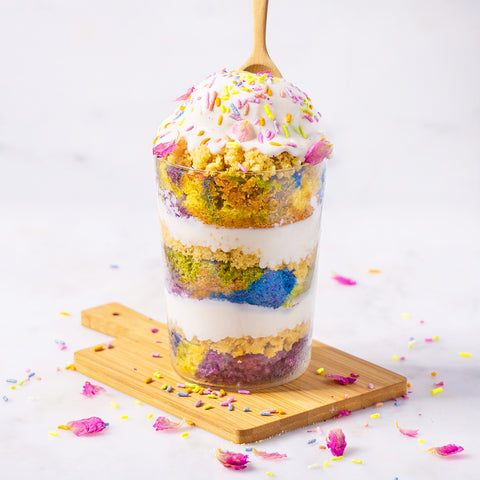 6. Top trifle off with cool whip, rose petals, and rainbow sprinkles. Serve and enjoy!