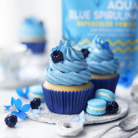 2. Frosting — Whip butter in the stand mixer bowl with the paddle attachment, on medium to high speed for about 2 minutes. Stop mixer and add the sifted powdered sugar, Suncore Foods® Aqua Blue Spirulina Powder, salt. Mix on low speed until incorporated, scrape the bottom and sides of the bowl and then add in vanilla and milk (if you’re looking for thinner consistency, mix on medium high speed for 1 to 2 minutes until smooth. Pipe the frosting onto the cooled cupcakes and serve.
