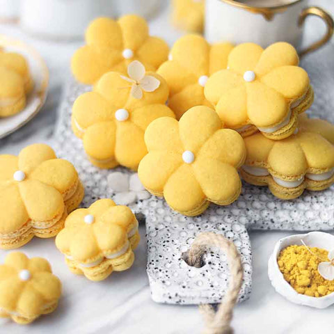 Happy New Year, friends! We've got sunshiiiine on a cloudy daayyyyy. As cute as can be, these macarons are so delicately sweet, you'll be pining for a whole bouquet of these delectable and fanciful flowers! This playful yet elegant yellow was made with Suncore Foods® Yellow Goldenberry Powder. Afternoon tea time will be sweeter and brighter with these delightful Goldenberry Turmeric Macarons. Despite looking like professionally made cookies, these pretty macarons are simple to make without losing that wow factor.