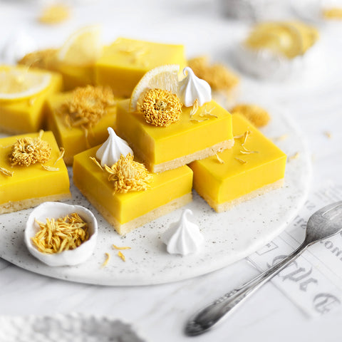 Get a taste of these citrusy Lemon Jasmine Goldenberry Tart Slices! With the addition of light floral notes, it's hard not to be dreaming of these! The vibrant yellows instantly reminds us of a bright summer day and as radiant as the sun! Garnished it off with Suncore Foods® Jasmine Flowers, these intricate flowers add a touch of beauty and vibrancy!
