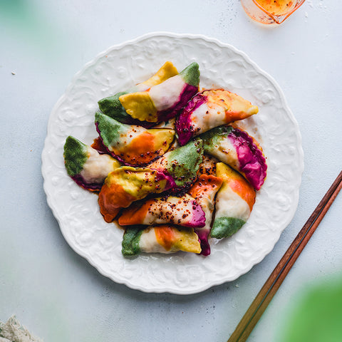 Eat the rainbow this weekend! Crowned as the best comfort food, the beauty of dumplings is once you have the basics down, it's easy to play around with what's in season or in your kitchen. Just like these Rainbow Dumplings colored majestically using Suncore Foods® Powders to color-code your dumplings or to make a rainbow for the 'gram. You can also store the remaining dough for later in triple wrapped in plastic wrap in the freezer so you can wow yourself with a rainbow of dumplings all over again. Bring out your inner artist with Suncore Foods® Powders and we hope your weekend is full of all the dumplings and delicious rainbows!