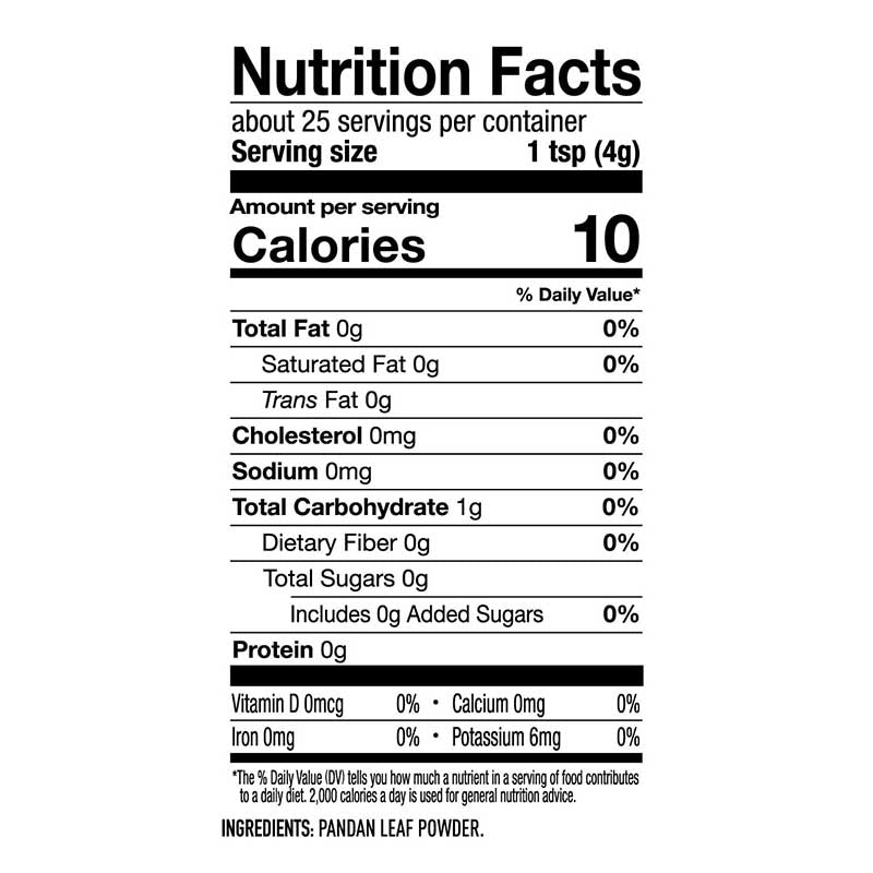 Chefs and foodies from around the world are using this wondrous plant to create award-winning dishes that sing with color. Pandan leaves have a beautiful emerald color that is often used to enhance the flavor of Asian rice dishes, desserts, and puddings. Bring on Suncore Foods® Emerald Pandan Leaf Powder into your favorite yogurts, smoothies, desserts, and baked goods—due to added ingredients in the recipe, color results may vary. Add some creative coloring to your next dish!