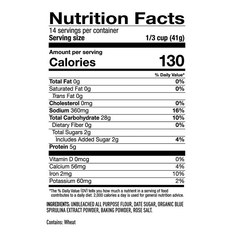 INGREDIENTS: Unbleached All Purpose Flour, Date Sugar, Organic Blue Spirulina Extract Powder, Baking Powder, Rose Salt