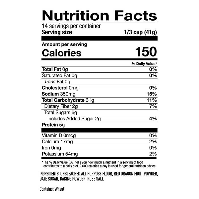 INGREDIENTS: Unbleached All-Purpose Flour, Red Dragon Fruit Powder, Date Sugar, Baking Powder, Rose Salt