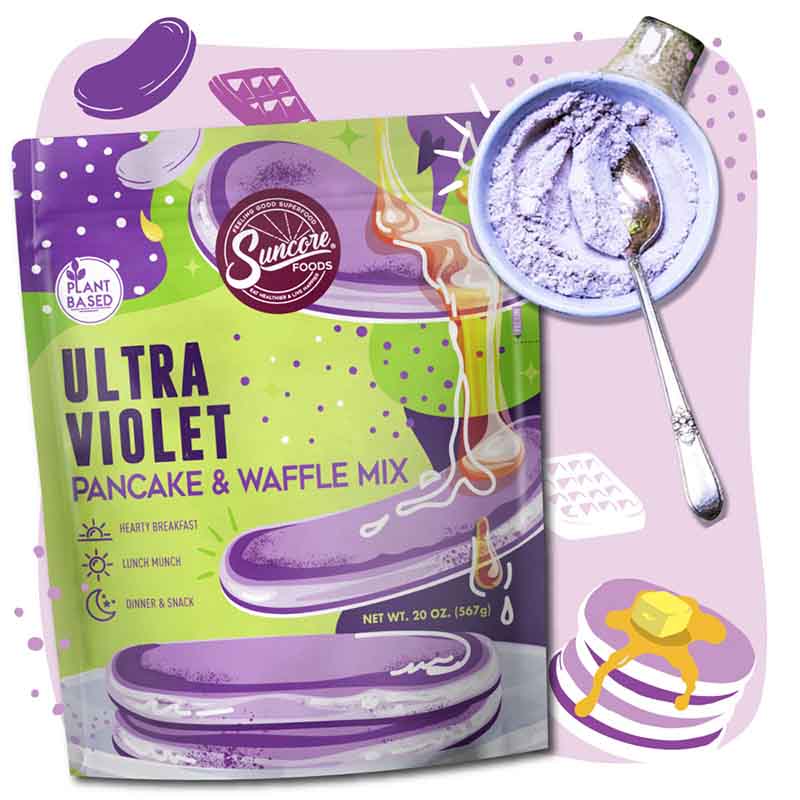 Start your morning off with a dash of delicious fun with Suncore Foods® Ultra Violet Pancake & Waffle Powder Mix. A sweet twist on a classic that sings with color. Light and fluffy. Simply delicious in each bite. A breakfast fit for a crowd of all ages to enjoy and discover a fairy tale wonderland. Perfect for breakfast, brunch, a quick snack, and more. Go ahead and make breakfast goodies any day, any time by whipping up delicious purple pancakes or waffles in the comfort of your own home. Bring on the delightful violet color and celebrate fun coloring to your creations.