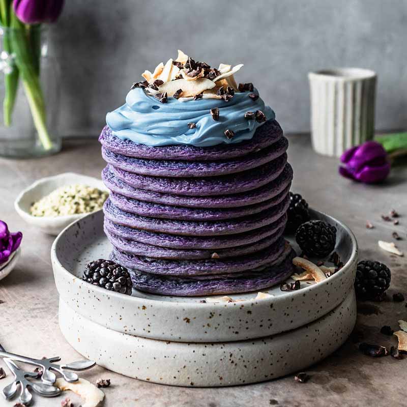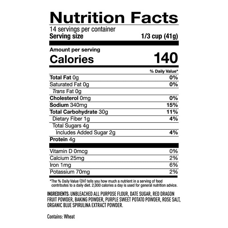 INGREDIENTS: Unbleached All Purpose Flour, Date Sugar, Red Dragon Fruit Powder, Baking Powder, Purple Sweet Potato Powder, Rose Salt, Organic Blue Spirulina Extract Powder