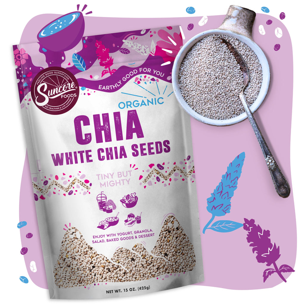 What can a teeny-tiny seed like this really do for you? Don’t let its size fool you; good things come in teeny-tiny seeds. White chia seeds were believed to provide energy and strength to ancient warriors. They were used for food and also pressed for oil. Suncore Foods® Organic White Chia Seeds are perfect for mixing into your favorite yogurts, smoothies, desserts, and baked goods. Let these teeny-tiny seeds light up your day!